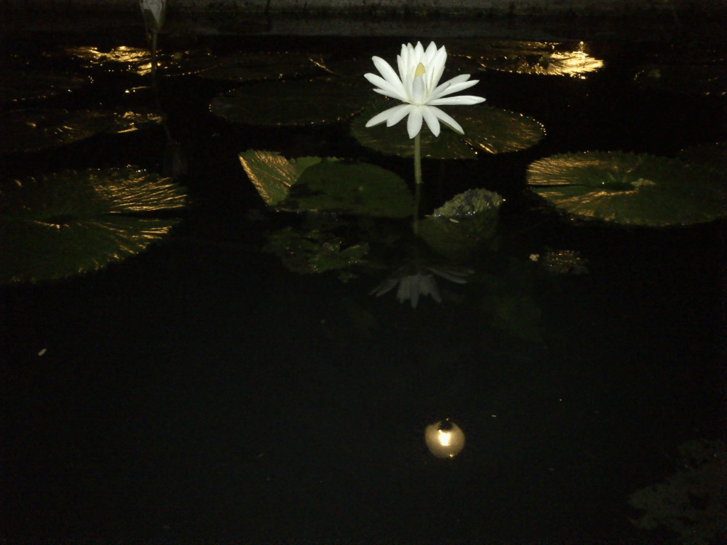 Hoa trắng như mây, trôi nổi giữa nền nước đen, phản chiếu ánh đèn vàng – tui đặt là Phù Vân.